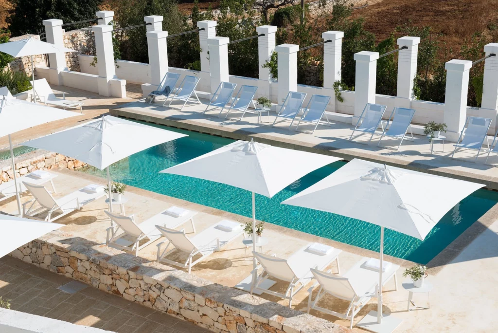 A whitewashed farmhouse restored with extraordinary restraint. Thick walls, pale stone floors, linen in soft neutral tones, olive trees framing each room. The design is so simple that it becomes luxurious. Every corner feels like it has existed for decades, even when it is new.