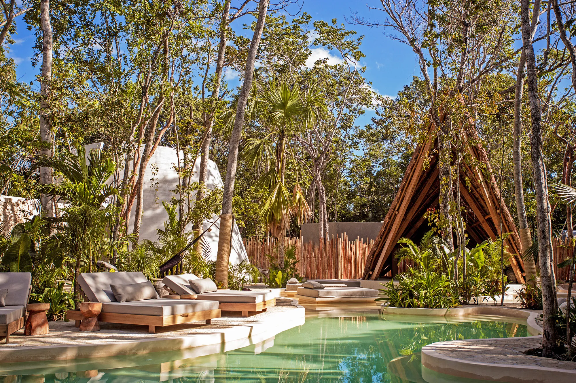 What you notice first is what is missing: there is no concrete, no marble lobby, no gleaming check-in desk. The cabanas are timber-framed, palapa-roofed, hand-built. Inside, the furniture is made by Mexican artisans to spec for the hotel: cement-cast bath tubs in some rooms, organic cotton linens, mosquito-net canopies over the beds. Bluetooth speakers, free purified water, and organic bath products in every room. The whole property reads like a single coherent piece of work rather than a collection of styled rooms.