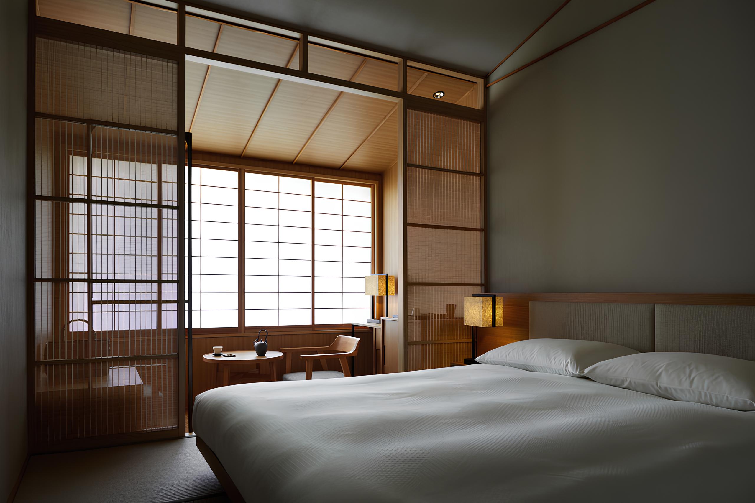 Le camere sono calme e curate con intenzione: pavimenti in tatami, luce soffusa, legno caldo e linee pulite. Sono piccoli rifugi pensati per il riposo, non per essere mostrati. Alcune si affacciano su giardini essenziali, dove le foglie si muovono leggere nella brezza.