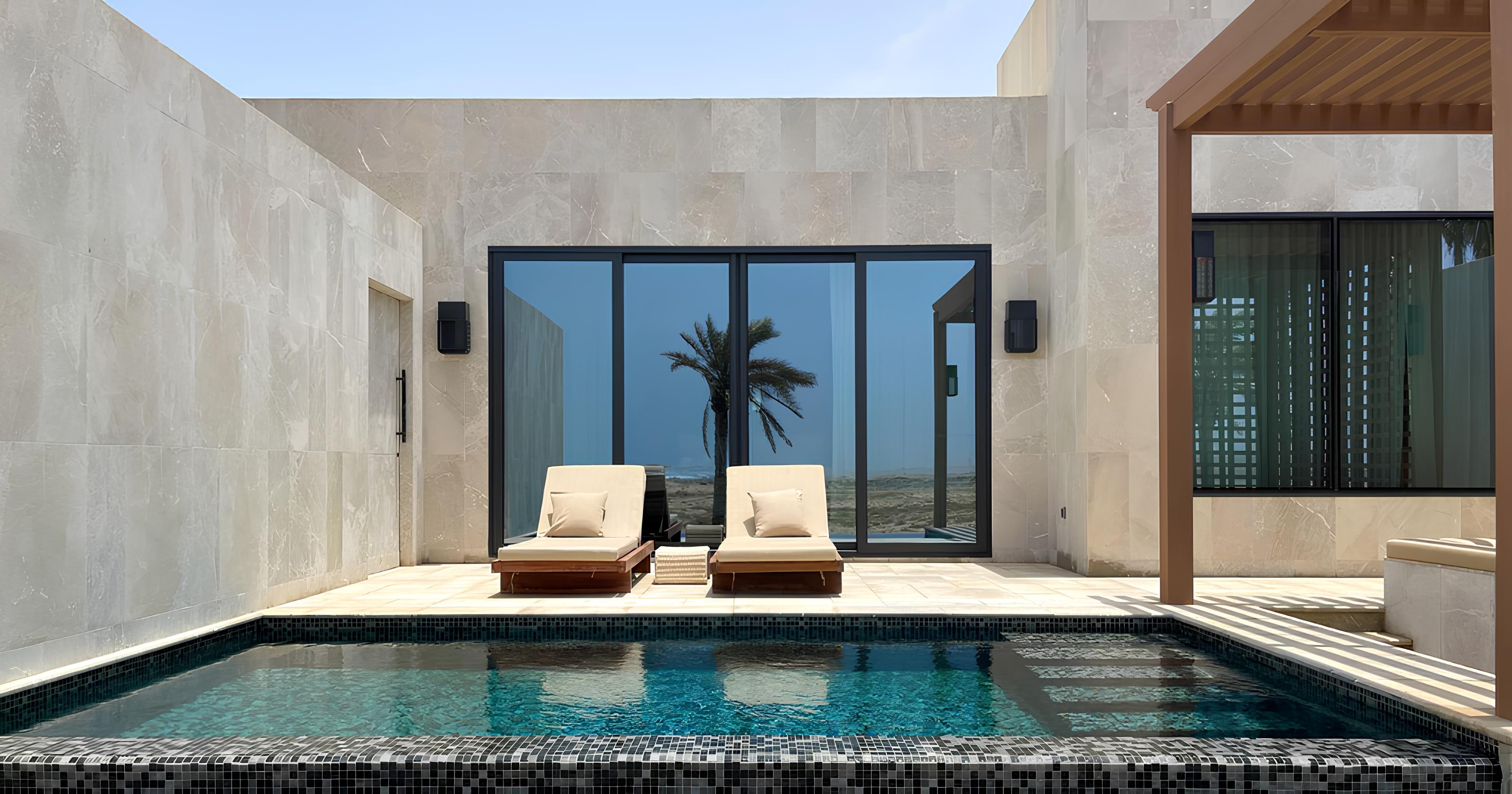 The 82 pool villas are constructed from local grey stone, cut from the same rock that rises behind them. Meranti hardwood, a durable tropical timber, appears in doors, window frames, and ceiling beams. Exteriors are finished in ochre paint that creates a mud-like effect, connecting visually to the earthen architecture of Oman's inland regions. The overall impression is of a village that has grown organically from its site rather than being imposed upon it.