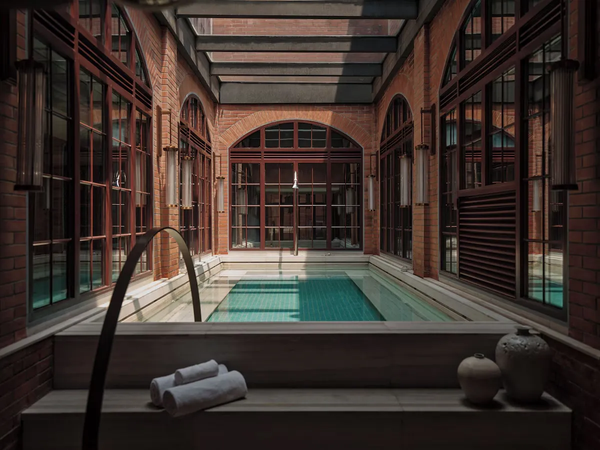 Auriga Spa draws on Traditional Chinese Wellness practices, with treatments calibrated to lunar phases. The swimming pool sits within arched redbrick walls beneath a vast skylight, the architecture itself functioning as aesthetic therapy.