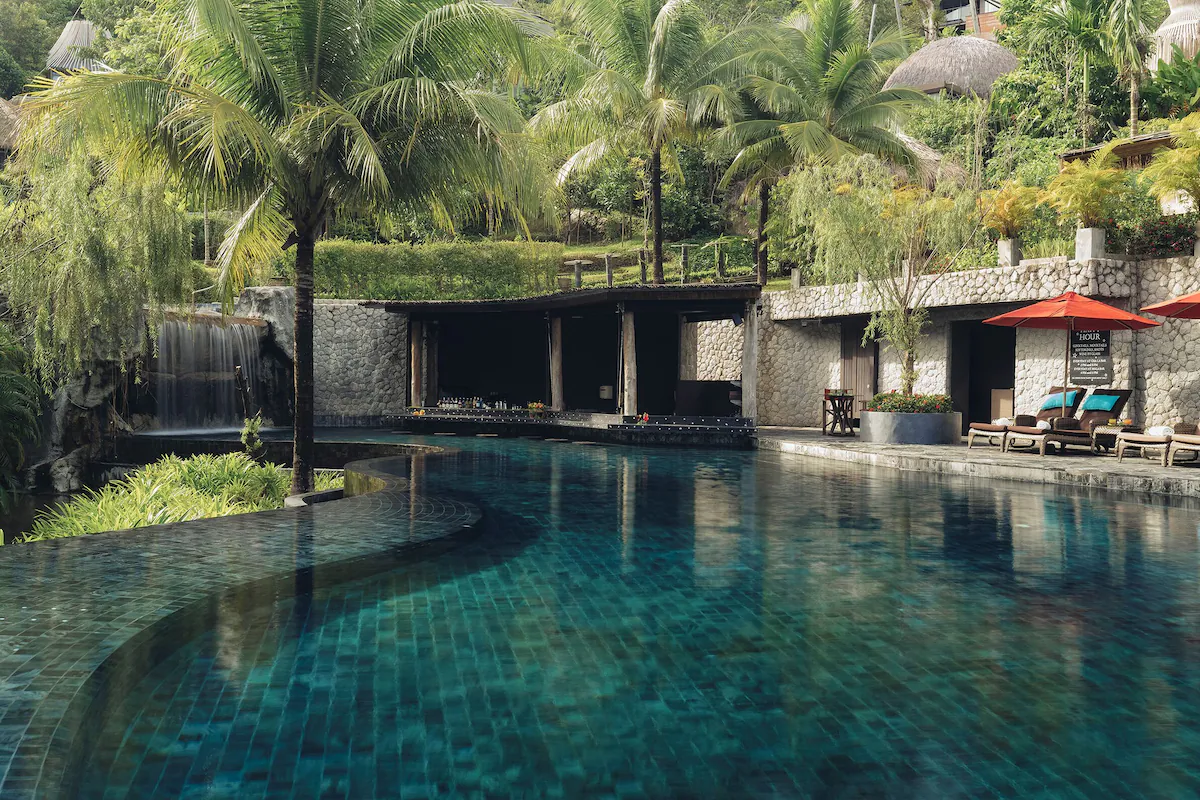 The main restaurant serves Thai, Indian, and international cooking, with roughly fifty percent of the produce grown in the hotel's own gardens. Chef Deepak Singh handles the Indian side, and his butter chicken and naan have developed a following. There are intimate dining pods scattered around the main swimming pool, two-person hideaways partly screened by a man-made waterfall.